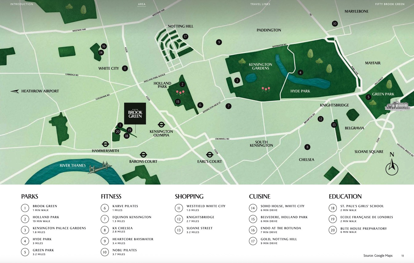 Fifty Brook Green 位於多個主要就業區的合理通勤範圍內,包括 Hammersmith、Kensington、西區與 Canary Wharf。這樣的地理條件,使其在租賃市場上能吸引來自不同產業背景的專業人士。